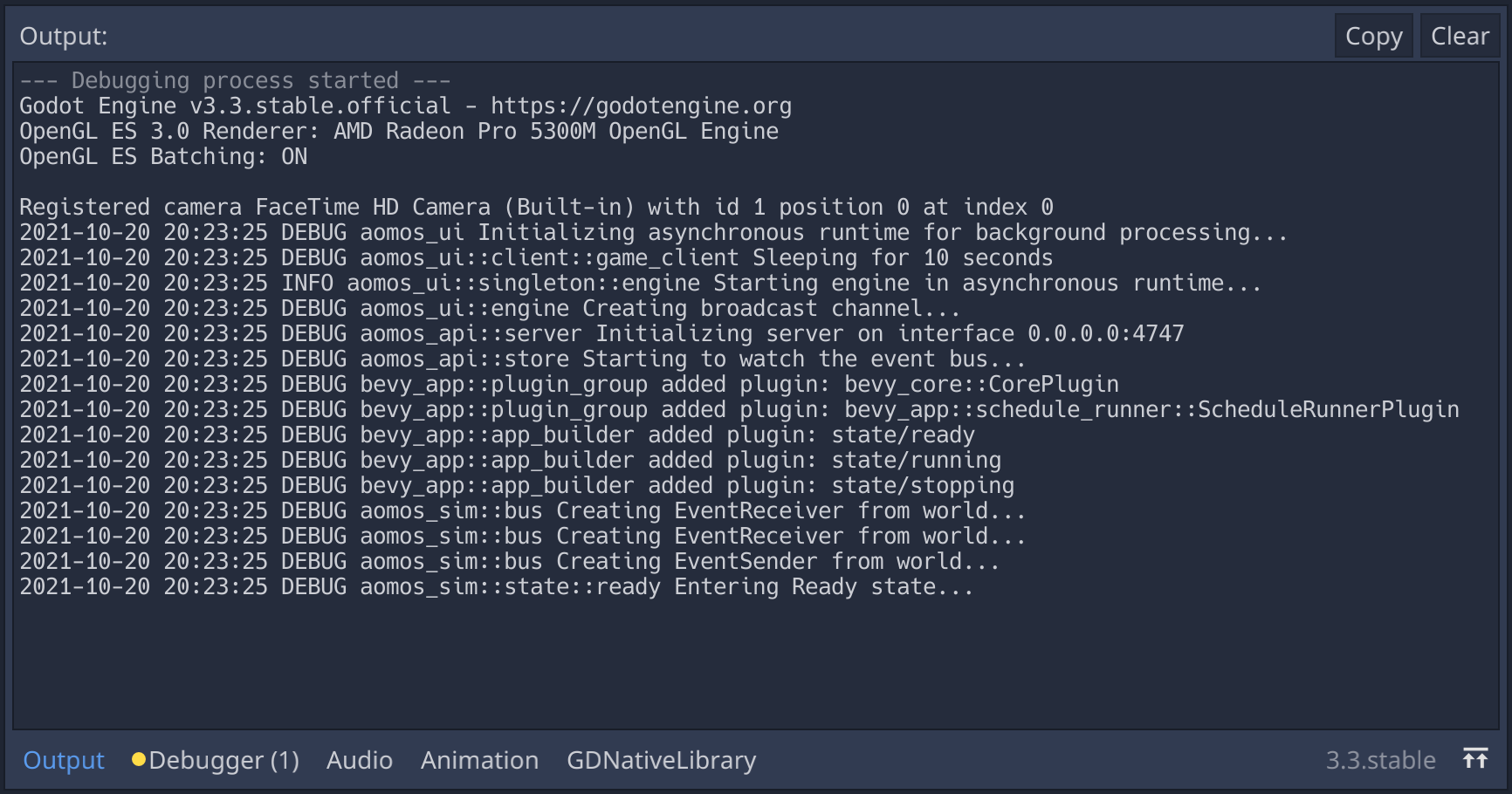 2021-10-20 20:00:00 DEBUG godot_logger Initialized the loggerBelow is a screenshot from my own project, which runs an embedded server built with Bevy and has its code split across a few different crates ( aomos namespace). As you can see, log statements in these libraries are picked up and printed inside Godot.